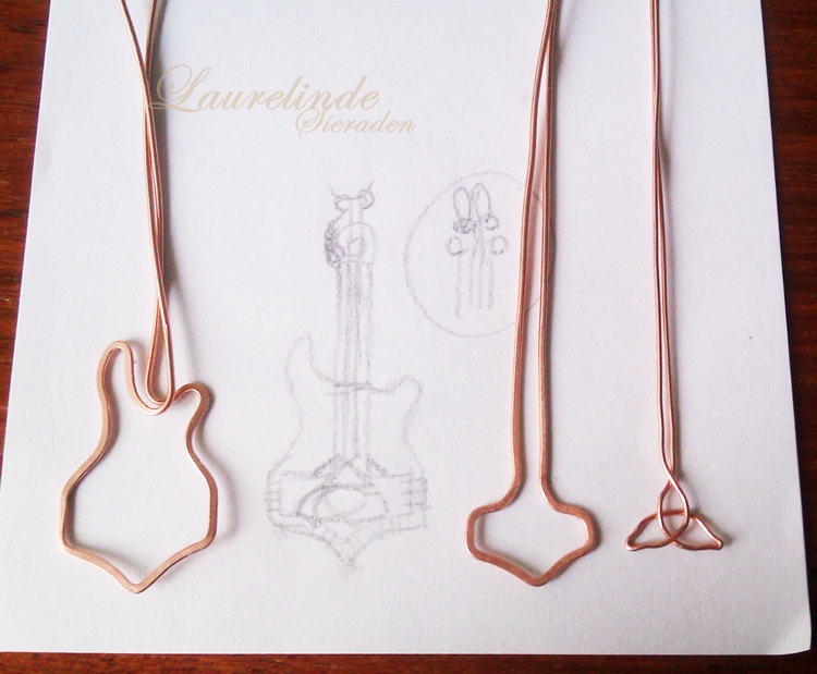 Hier zie je de losse onderdelen, met de tweede schets. Om de Noorse invloed duidelijk te maken voegde ik een Trefoil knoop van koper toe aan de hamer. Ik liet deze verder naar boven uitlopen, waarbij de lijnen mooi snaren konden symboliseren.