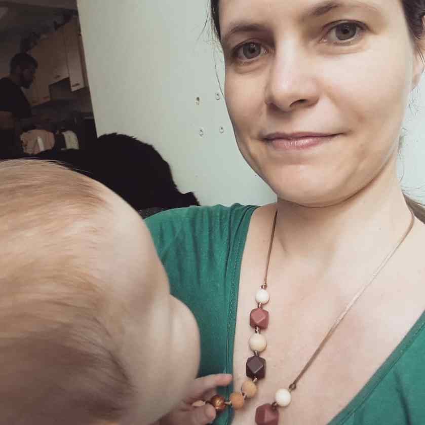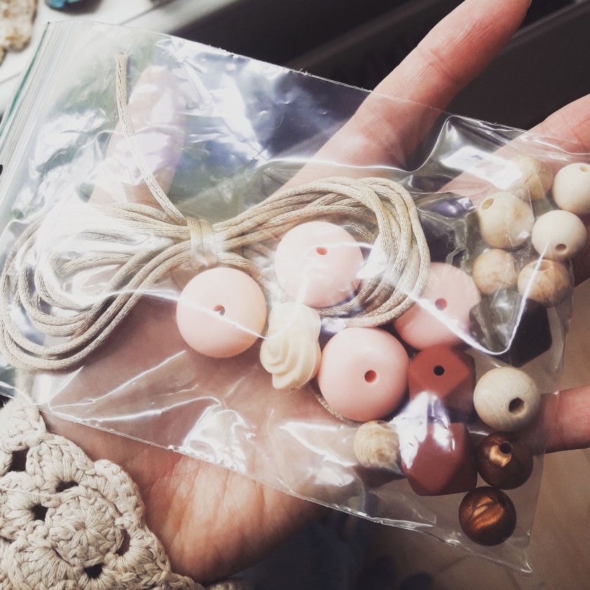 Mijn dochter is nu hard aan het ontdekken dat wat mama heeft echt veel interessanter is dan wat ze zelf heeft. Bovendien steekt ze alles graag in haar mond. Het leek me dus wel handig om iets te maken dat ik kan dragen als sieraad en dat leuk voor haar is om mee te spelen. Een soort snoepjesketting. Dat hele idee was gelukkig al een bedacht door iemand anders en zo kon ik makkelijk een beetje afkijken.