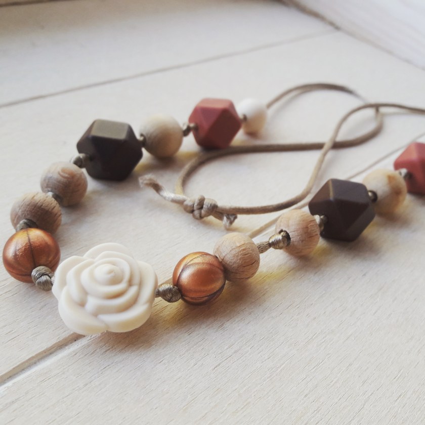 Mooie neutrale kleuren maken deze ketting makkelijk te combineren. Ik heb helemaal niet het gevoel dat ik speelgoed om heb. Mijn dochter dan weer wel. Ik koos veel verschillende vormen, kleuren en maten zodat het voor haar interessant is om te ontdekken.